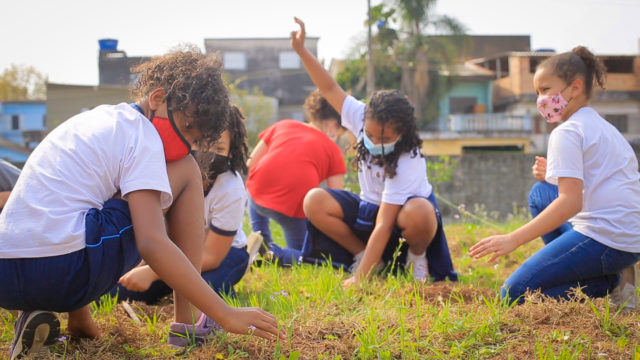 A organização realiza o plantio participativo de miniflorestas de Mata Atlântica nas escolas, além de formação de professoras e professores em formato on-line