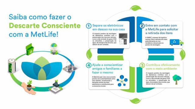 A MetLife, uma das maiores empresas de serviços financeiros do mundo, acaba de firmar uma parceria com a empresa GM&C, de soluções em logística reversa e reciclagem, passa a oferecer a todos os cerca de 50 mil clientes dos seguros de vida – Vida Total, Vida Segura e Vida Protegida – no Brasil, a oportunidade de realizarem gratuitamente o descarte correto de itens eletrônicos como computadores, impressoras, aparelhos de som e vídeo portáteis, videogames, pilhas e lâmpadas, celulares, fones e cabos. Com a parceria, a empresa dá um passo importante em seu objetivo de contribuir, de forma concreta, com a economia circular e fortalecer seu pilar de sustentabilidade.