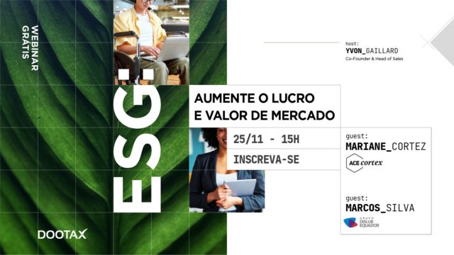 A startup Dootax, promove webinar gratuito com o tema “ESG: aumente o lucro e valor de mercado”, que será realizado no dia 25 de novembro, às 15h. As inscrições podem ser feitas no link .